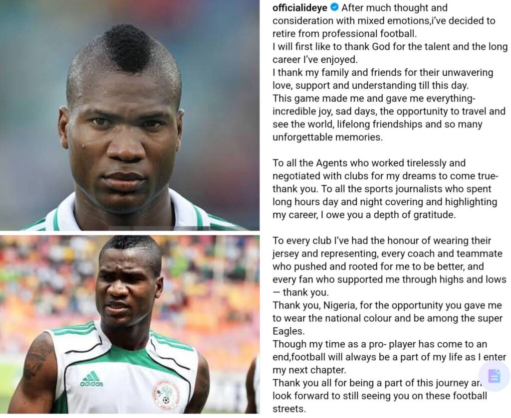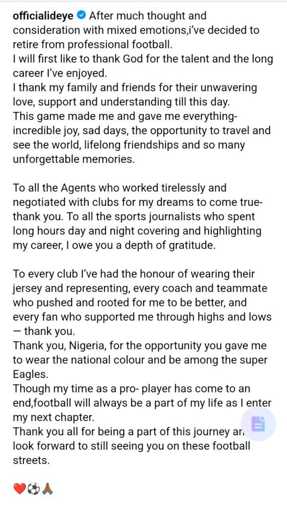 “After much thought and consideration with mixed emotions, I’ve decided to retire from professional football… This game made me and gave me everything— incredible joy, sad days, the opportunity to travel and see the world, lifelong friendships and so many unforgettable memories,” Ideye wrote.