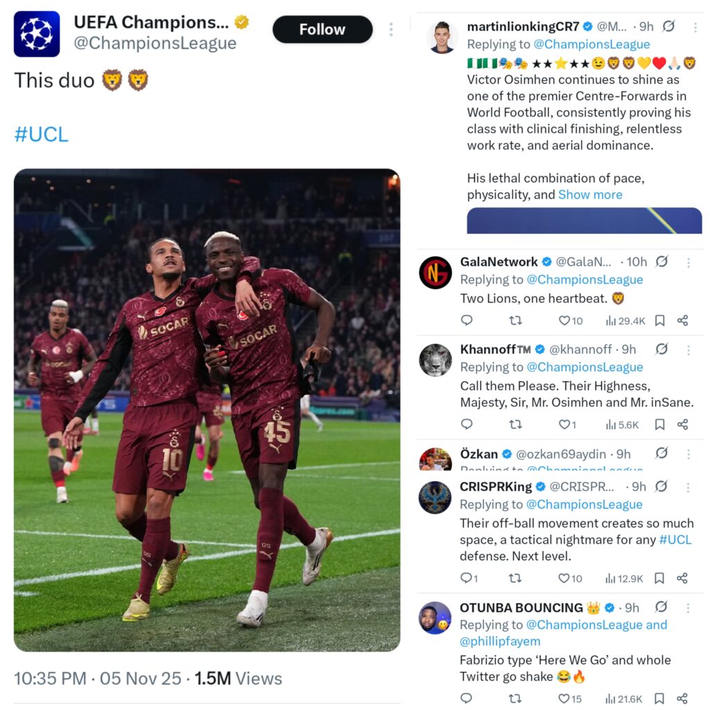 “What a beast! Osimhen’s turning the UCL into his personal playground… Galatasaray’s roaring louder than that lion tifo.”