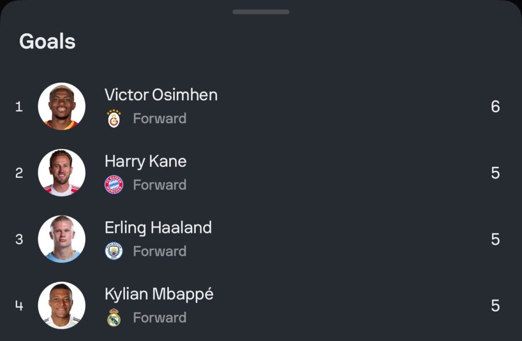With this treble, Osimhen has now scored six goals in four Champions League matches this season, placing him ahead of leading names and firmly at the top of the scoring list.
