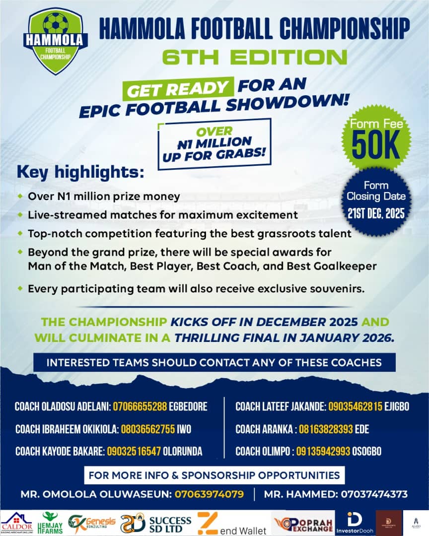 The 6th edition of the Hammola Football Championship is here and it’s shaping up to be bigger and better. Registration & Entry Information Registration opens now and closes 21st December 2025. Form fee: ₦50,000. Interested teams or coaches can reach out to the mobilization contacts below: Coach Adelani (Egbedore): 070 6665 5288 Coach Okikiola Ibrahim (Iwo): 080 3656 2755 Coach Kayode (Olorunda): 090 3251 6547 Coach Lateef Jakande (Ejigbo): 090 3546 2815 Coach Aranka (Ede): 081 6382 8393 Coach Olimpo (Osogbo): 091 3594 2993 Venue All matches will be held…